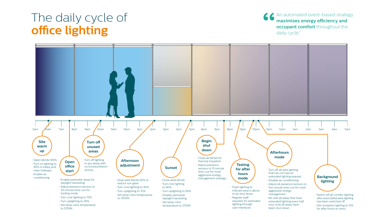 แทนที่จะพึ่งพาพนักงานในการเปิด-ปิดไฟตลอดเวลา ระบบควบคุมของ Philips Dynalite จะทำงานร่วมกับเซ็นเซอร์แบบมัลติฟังก์ชั่น (Multifunction Sensor) ในการตรวจจับคลื่นความร้อนของวัตถุที่เคลื่อนไหว (PIR Detector) บุคคล/การเข้าใช้งานพื้นที่ของบุคคล (Presence/Occupancy Detector) และแสงธรรมชาติ (Daylight Detector) เพื่อสั่งการเปิด-ปิด หรือเพิ่ม-ลดความสว่าง และปรับ-เปลี่ยนโทนสีของแสง (Daylight - Warm White) ของโคมไฟในออฟฟิศ/สำนักงานแต่ละดวง แต่ละกลุ่ม เพื่อการประหยัดพลังงาน และเพิ่มความสะดวกสบายในการทำงาน ตามแต่ละช่วงเวลาของวันโดยอัตโนมัติ ดังตัวอย่างต่อไปนี้